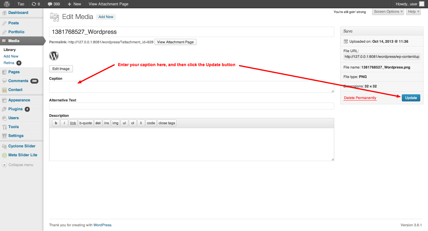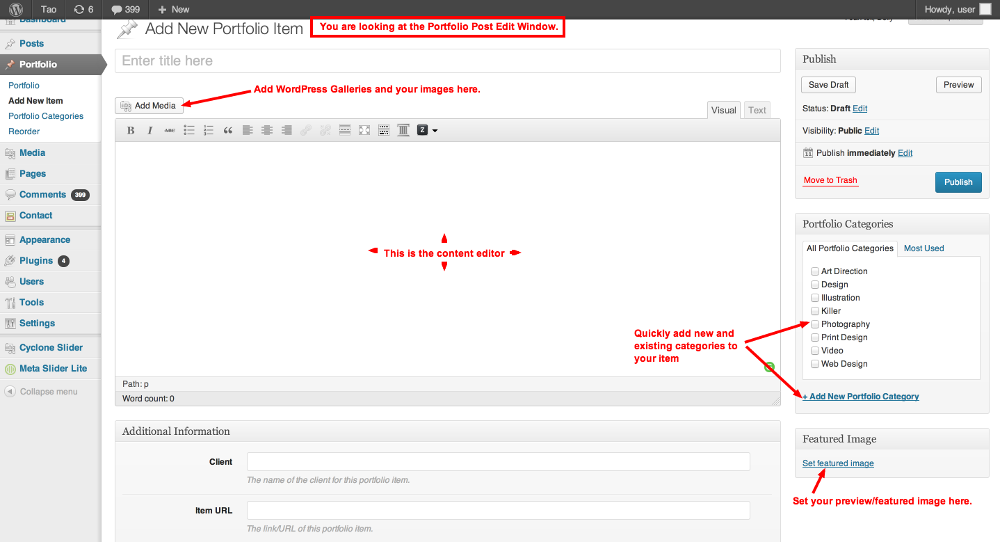 To add a new portfolio item, navigate to the Portfolio » Add New Item tab. Here you can add images and videos in the content editor, assign categories to the item in the "Portfolio Categories" post option box, and add additional information, such as the description of the item, and the URL of the project. To illustrate that, here is a screenshot of the portfolio edit window: