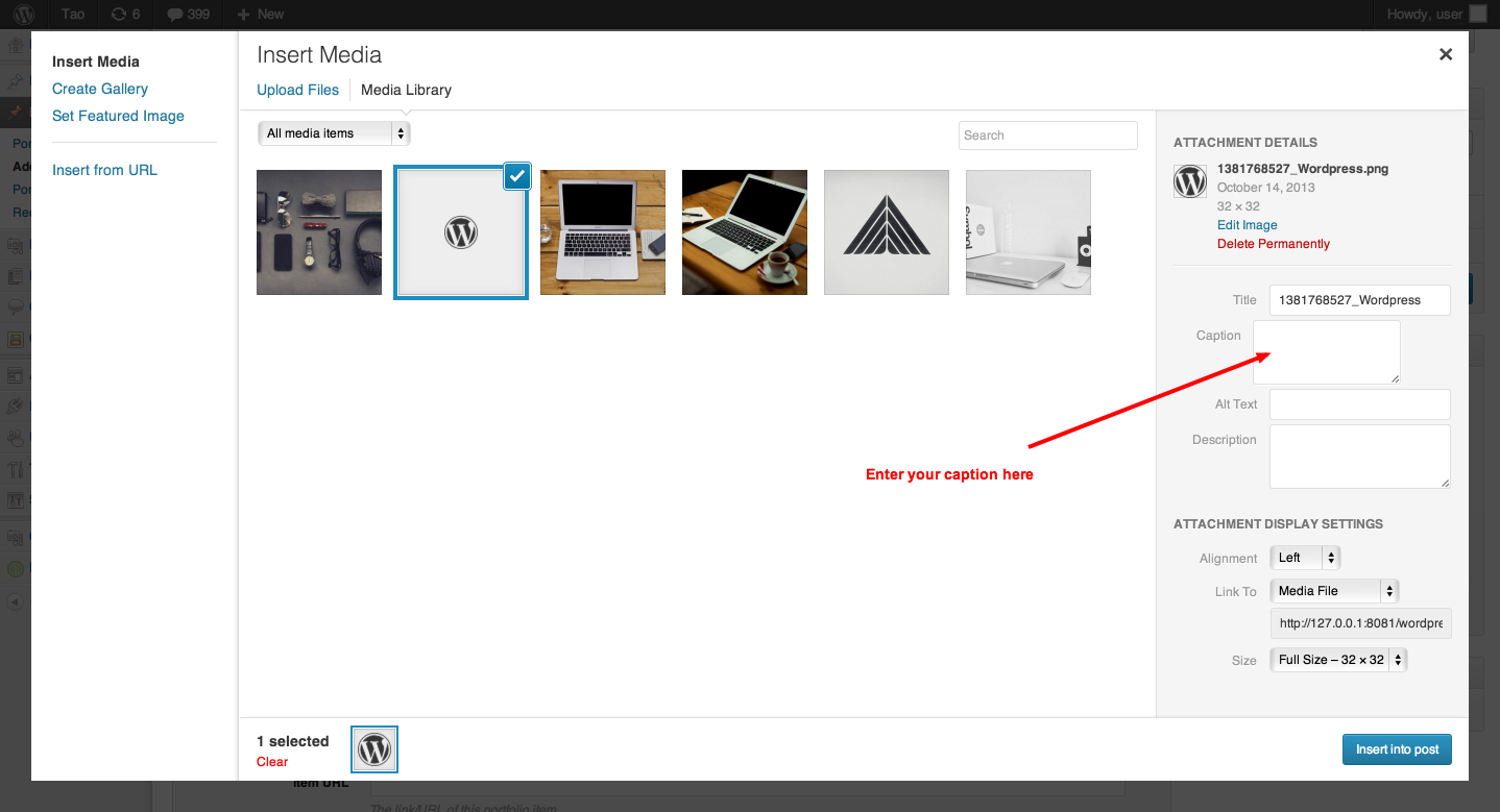 You can easily add captions to your images, by editing the "Caption" fields, under the Media » Library tab of your WordPress admin panel, or in the media uploader modal window. The following are the screenshots, that depict the two mentioned methods: